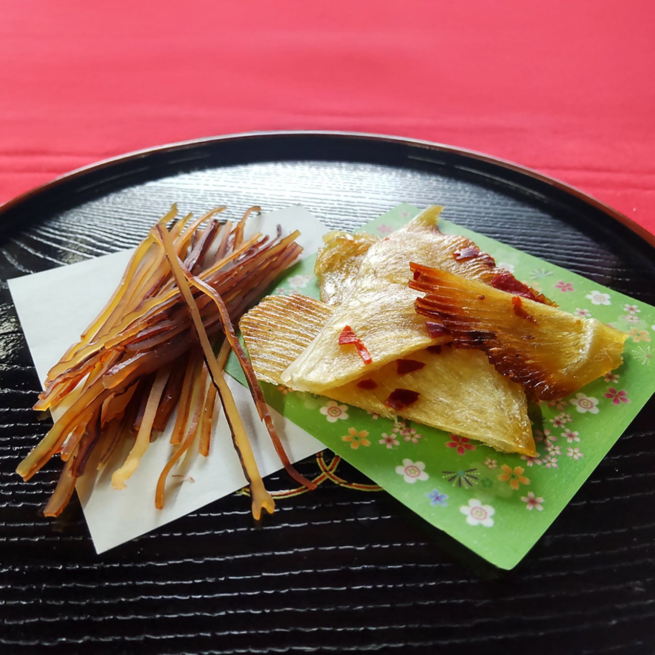 焼えいひれー原材料:えい、砂糖、日本酒富士山、唐辛子、食塩、水飴、発酵調味料、醤油/ソルビトール、トレハロース、調味料(アミノ酸等)、甘味料(ステビア)