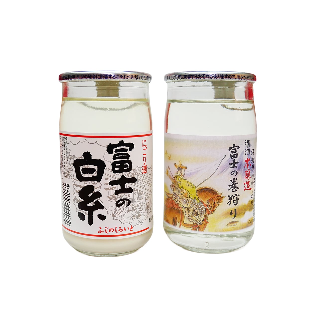 大河ドラマ鎌倉殿の13人にも登場する雄大な富士野(ふじの)で行われた巻狩りをイメージした富士宮の地酒「富士の巻狩り」(登録商標)のカップ酒と、にごり酒「富士の白糸」(商標登録)のカップ酒にお猪口が付いたキャンプや家飲み用の蔵元限定セットです。